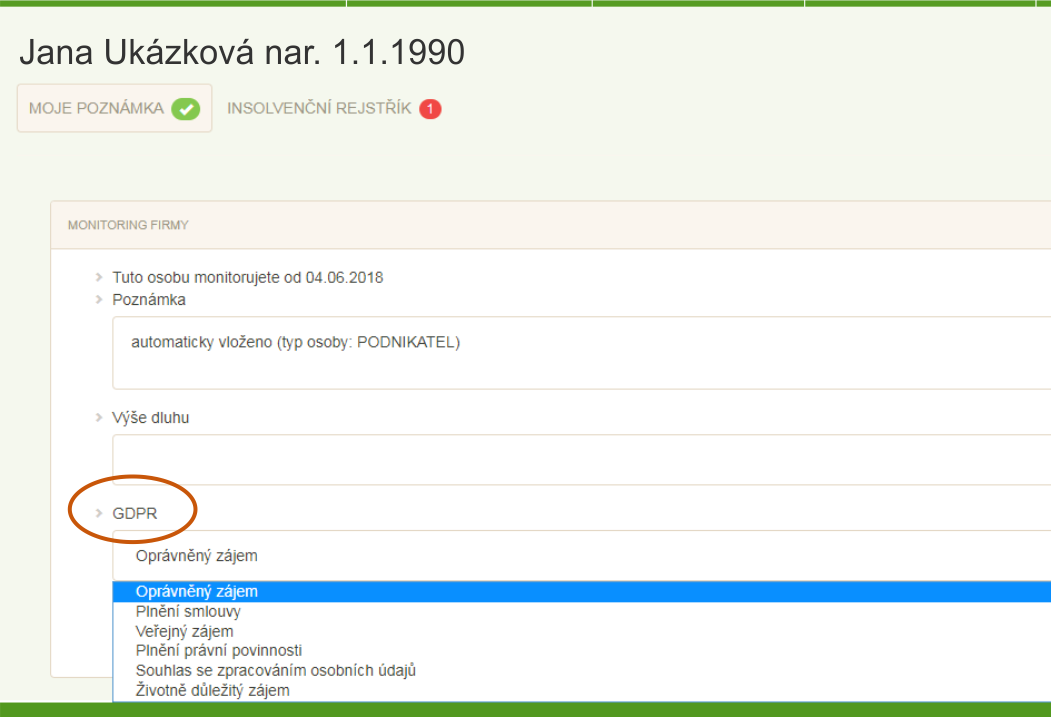 U všech nových tarifů je GDPR modul automaticky. Jakmile jste přihlášeni do systému, můžete si u každé monitorované fyzické osoby nastavit právní důvod jejího monitorování, a to v záložce MOJE POZNÁMKA.