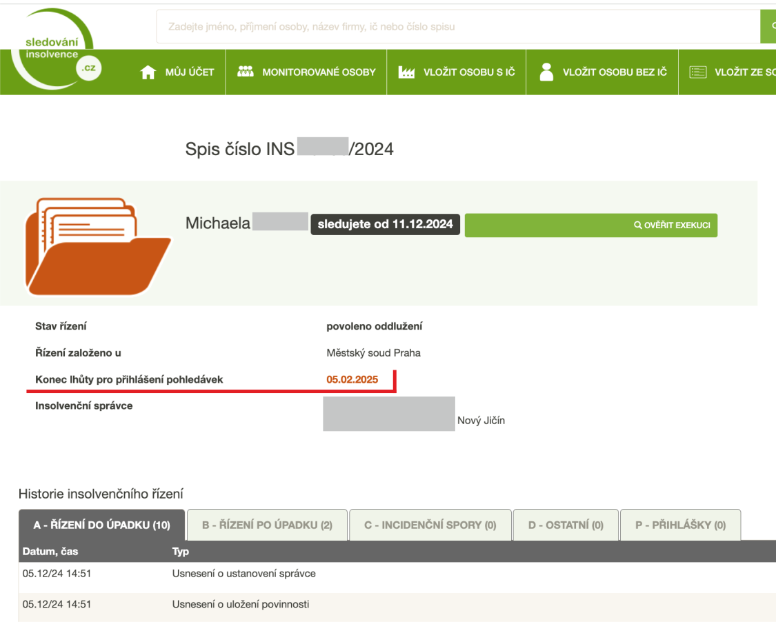 Konec lhůty pro přihlašování je uveden jak u insolvenčního řízení v systému (po přihlášení), v jednotlivých informačních e-mailech a také v exportu monitorovaných osob.
