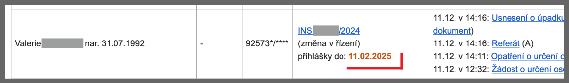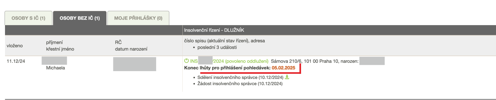 2. Konec lhůty pro přihlášení pohledávek je uveden v přehledu sledovaných osob,