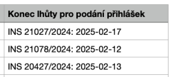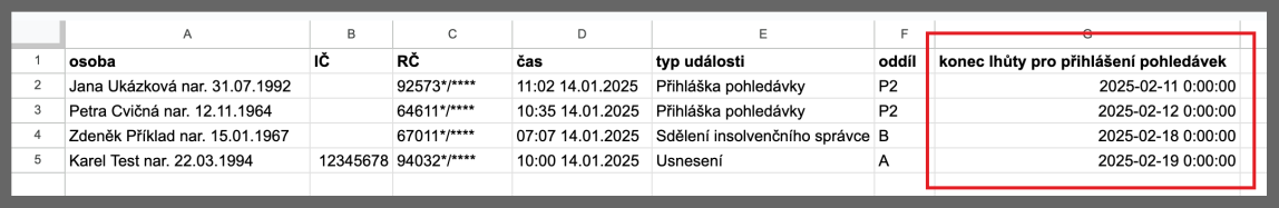 V exportu monitorovaných osob najdete v posledním sloupci data, kdy končí lhůta pro podávání přihlášek a to ve formátu rrrr.mm.dd. I zde tak na první pohled vidíte, kolik času na podání přihlášky zbývá.
