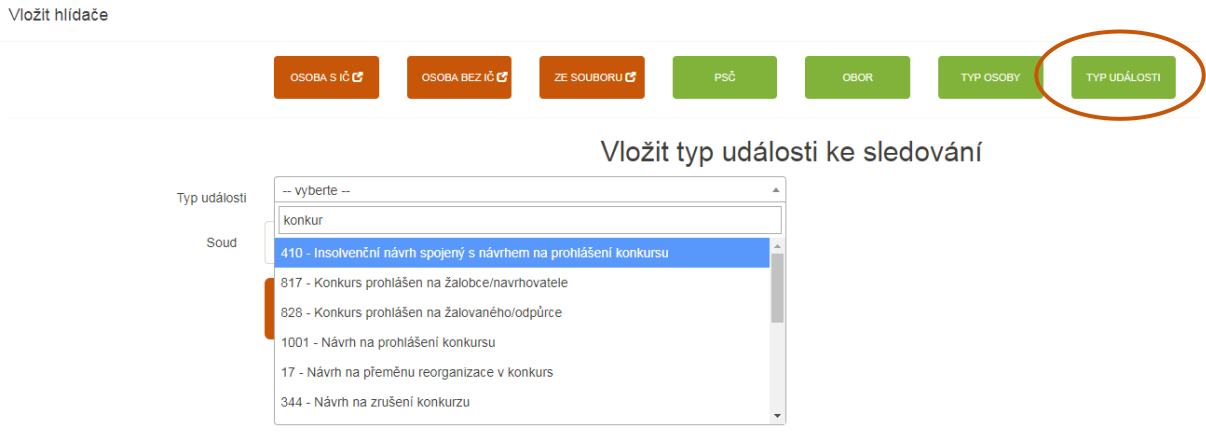 Vyberte událost, která vás zajímá, vyberte insolvenční soud, a vložte ke sledování.