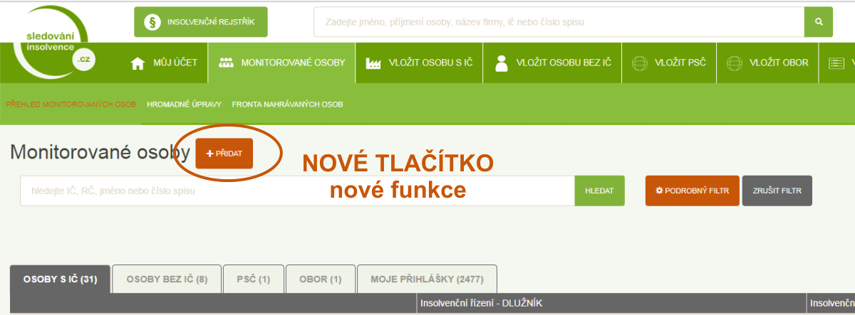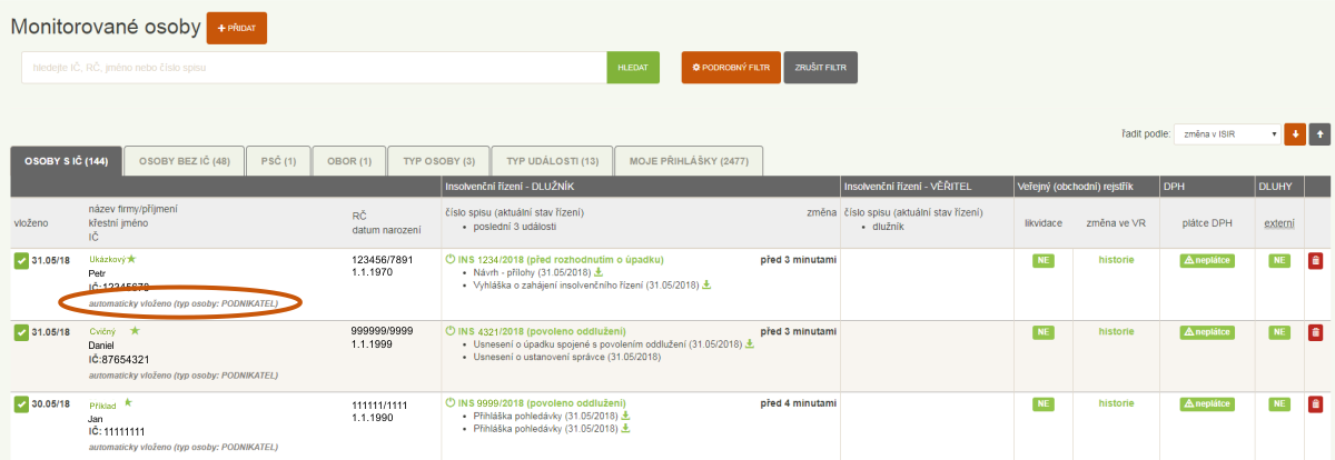 Monitoring podle typu osoby/typu události je součástí tarifu ISIR Profi (ceník a objednávky)