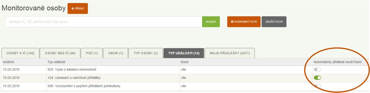 Pokud máte nastaveno automatické přidávání řízení k monitoringu, vidíte aktuální přehled v záložce monitorované osoby.